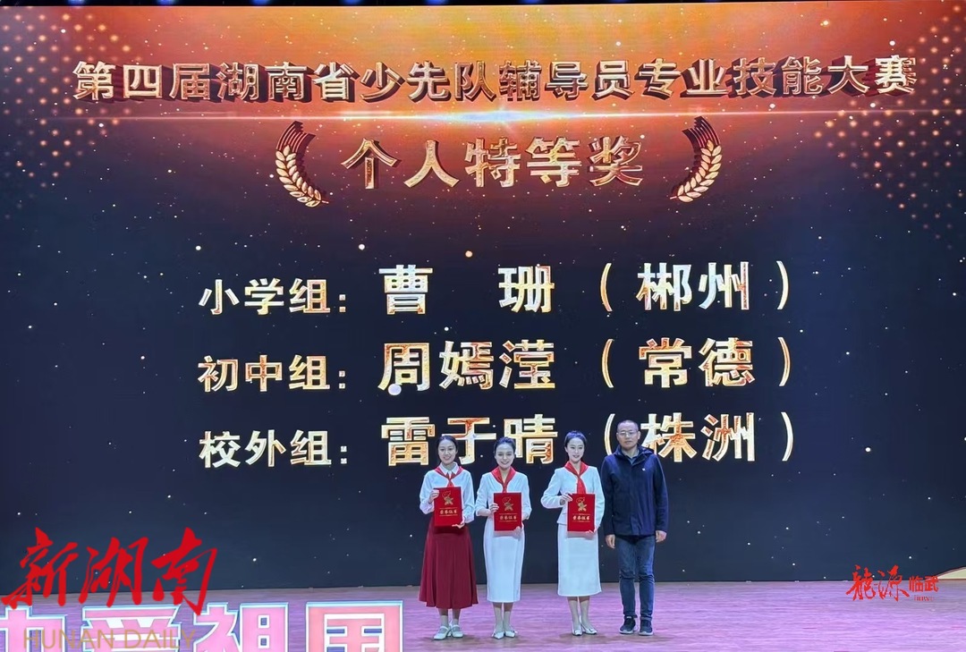 特等奖的获得既是个人的奋勇拼搏,也是团队合作的结晶。比赛过程中,郴州市少先队黄艳名师工作室、湖南省少先队邓静名师工作室组建了强大的后援团,聚焦少年儿童政治引领,用“童言童语”讲述党的创新理论,将“大道理”转化为“小故事”,创新活动课程教学形式,确保少先队工作的政治性、先进性、自主性和实践性。
