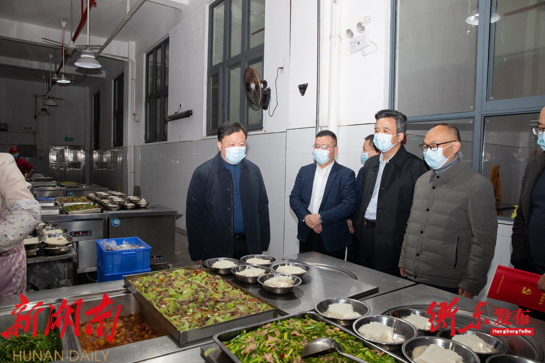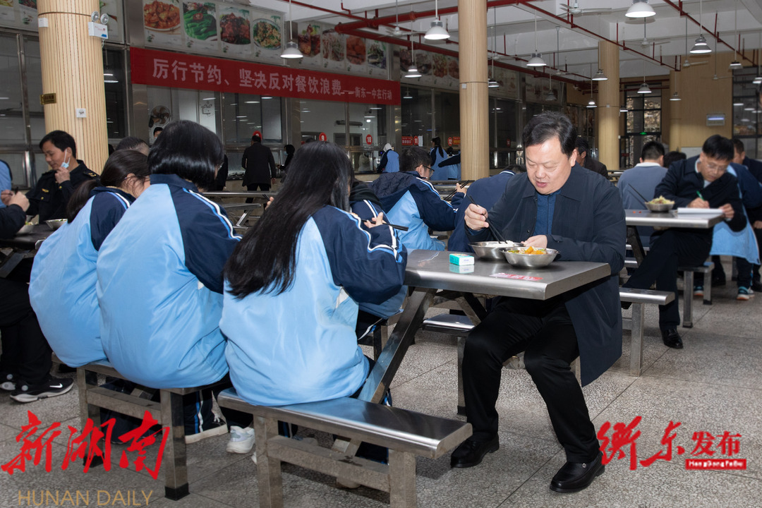 思政课后,谭建华来到学校食堂督导校园食品安全,实地查看食堂卫生环境、配餐标准以及用餐环境等,听取食品安全工作相关情况汇报。正值食堂午餐期间,谭建华来到取餐窗口亲身体验排队取餐,与学生共用午餐,并和学生亲切交谈,详细询问学生们的日常用餐、学习、生活等情况。