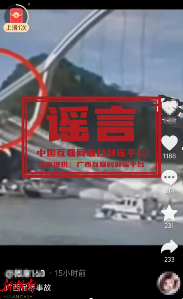 真相: 近日,有网民在短视频平台发布内容为吊桥垮塌事故的视频,并称该事故发生在广西境内,引发网民关注。视频显示,一吊桥绳索断裂导致桥体垮塌,一辆来不及过桥的货车也落入水中。经广西互联网辟谣平台核实比对,网传“广西吊桥垮塌事故”视频实际上为2019年台湾南方澳大桥发生吊杆断裂并导致桥梁垮塌。网传视频系移花接木造谣。(来源:“广西互联网违法和不良信息举报中心”微信公众号)
