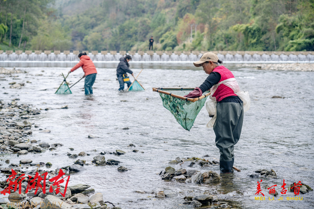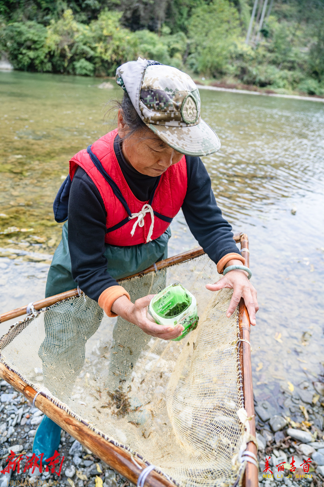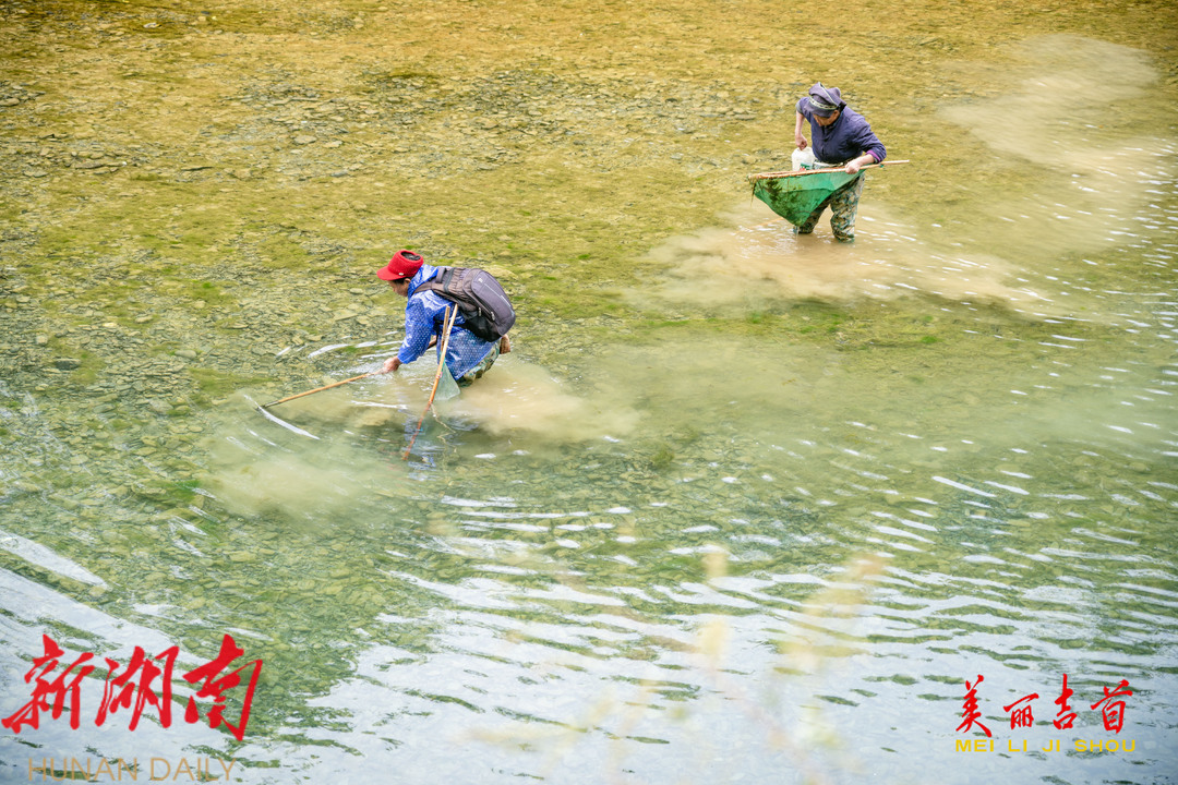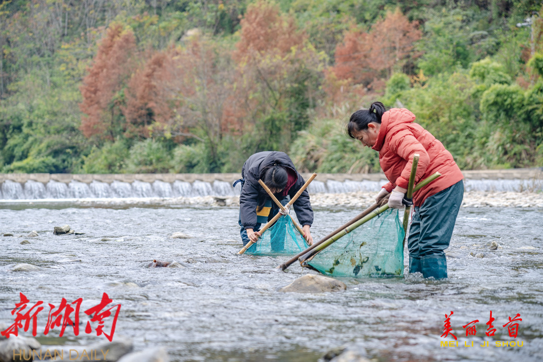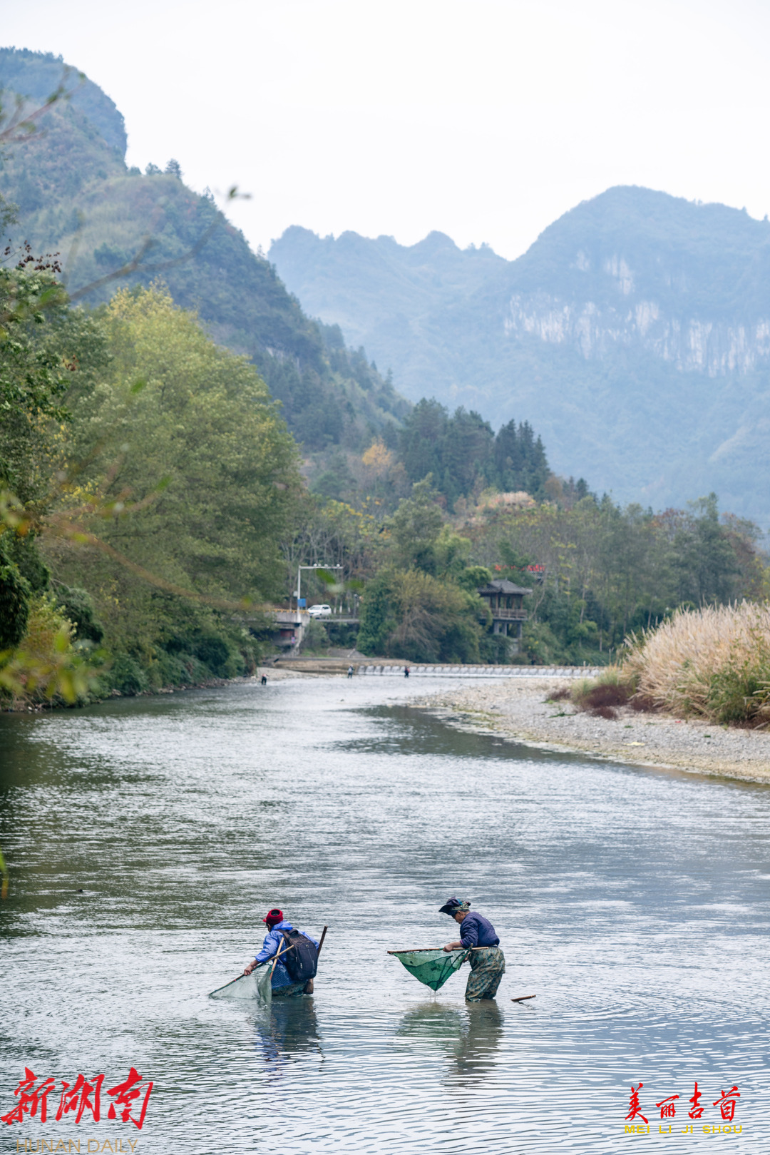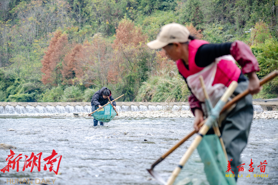 12月8日,吉首市矮寨镇新溪村,村民在峒河捕捞桃花虫和河虾。近年,当地群众依靠峒河优质水源,适时进行桃花虫和河虾捕捞,及时供应市场,丰富地方特色美食,增加收入。