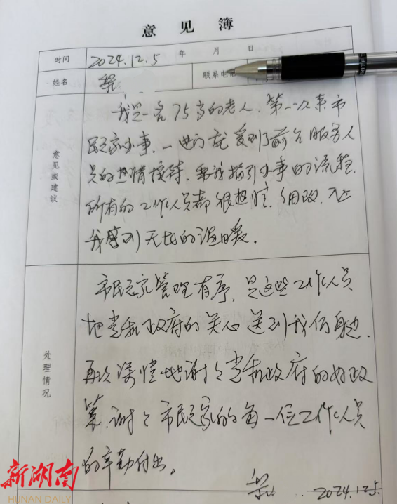 湖南日报·新湖南客户端12月10日讯(通讯员 舒玉娇) “服务人员热情接待,工作人员耐心细致,真心感谢市民之家的每一位工作人员的辛勤付出。”近日,在市民之家一楼意见簿上,黎娭毑写下这样一段话。字里行间,既有对前台工作人员的感激,更是对浏阳政务服务工作的由衷认可。