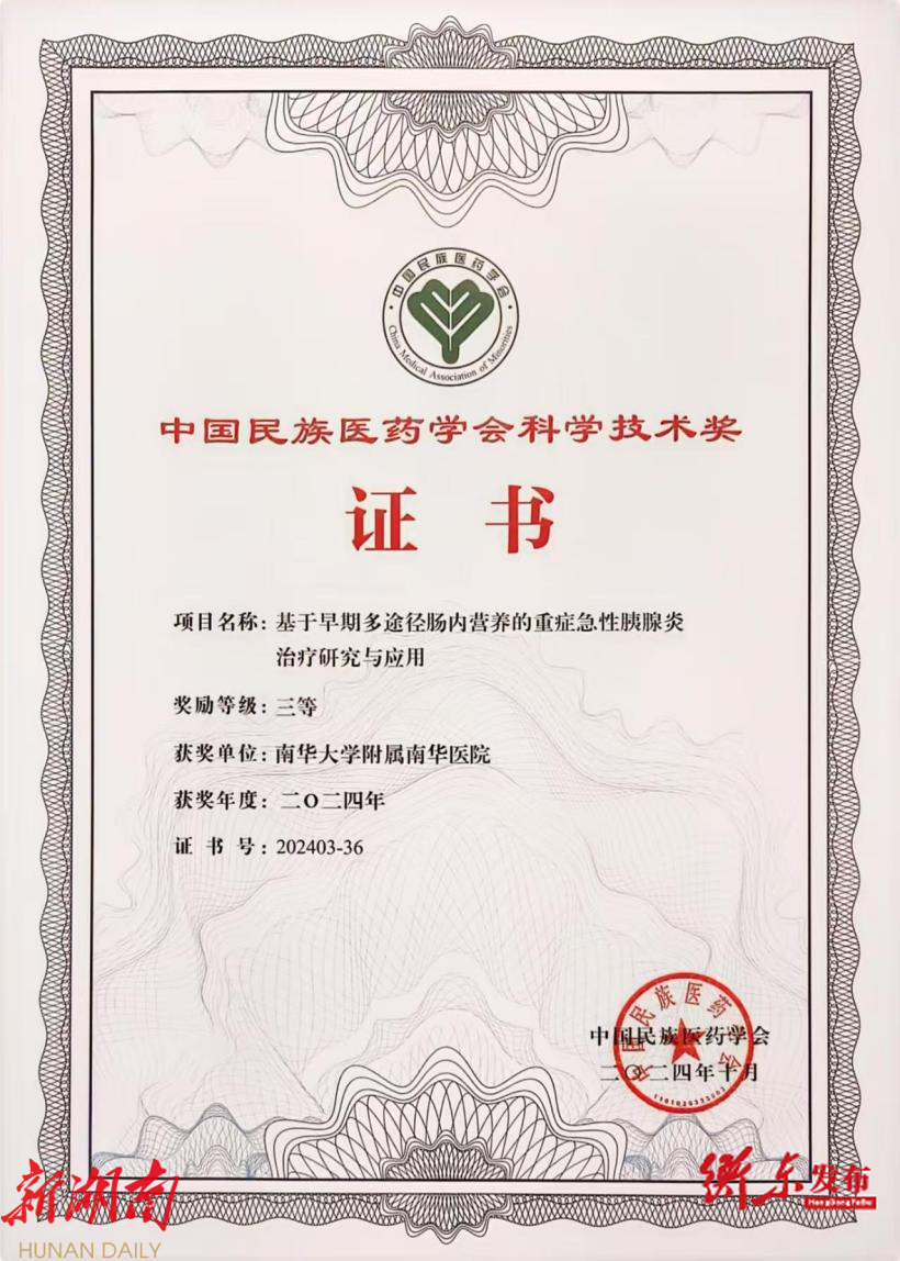 衡东融媒12月9日讯(通讯员 贺承健 陈染羲)12月7日,中国民族医药学会2024年学术大会暨科学技术奖颁奖大会在北京隆重召开。南华大学附属南华医院副院长刘龙飞带领的研究团队凭借《基于早期肠内营养的重症胰腺炎治疗研究进展》项目,荣获中国民族医药学会科学技术奖“三等奖”。