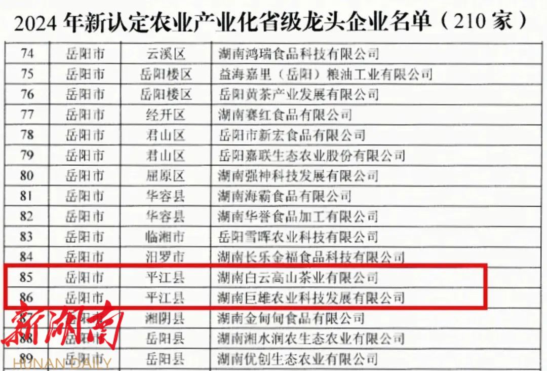 近日,湖南省农业农村厅发布《关于2024年拟新认定或监测合格农业产业化龙头企业名单的公示》,湖南省新增127家农业产业化省级龙头企业。其中,我县湖南白云高山茶业有限公司、 湖南巨雄农业科技发展有限公司 上榜。