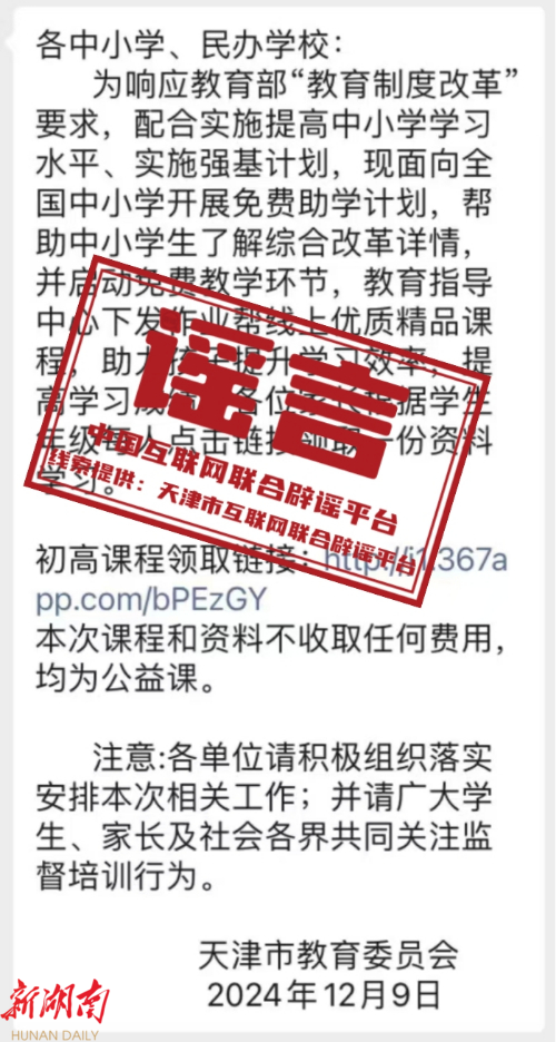 真相: 近期,一则署名为“天津市教育委员会”的信息在网上传播,信息中提及“开展免费助学计划”“启动免费教学环节”“下发线上优质精品课程”“各位家长根据学生年级点击链接领取资料”等相关信息。经天津市教委核实,该信息非天津市教育委员会所发,相关信息不实。请广大网民切莫轻信、点击信息中链接,以免上当受骗。(来源:“天津辟谣”微信公众号)