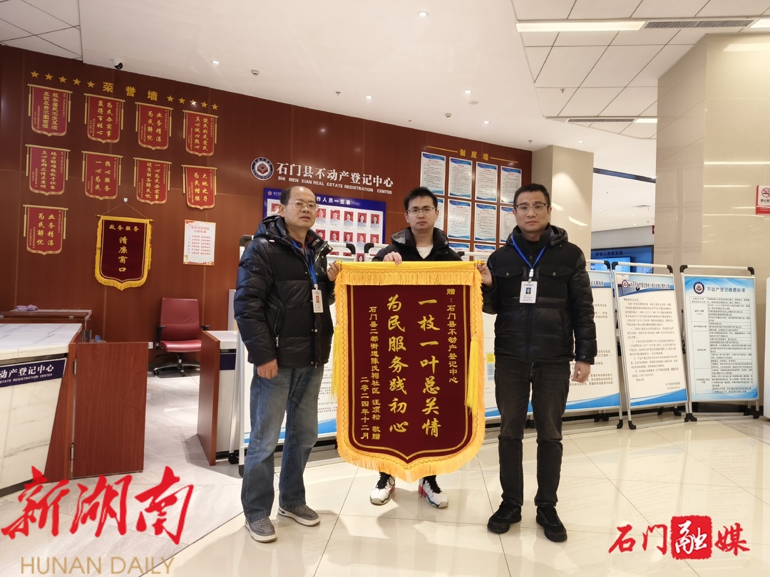 湖南日报·新湖南客户端12月11日讯(记者 杨帆 向亚萍)12月9日,二都街道陈氏祠社区居民汪强将一面锦旗送到石门县自然资源局,感谢该局干部职工帮助解决他父亲汪顶松多年以来关心的不动产权证书办理问题。
