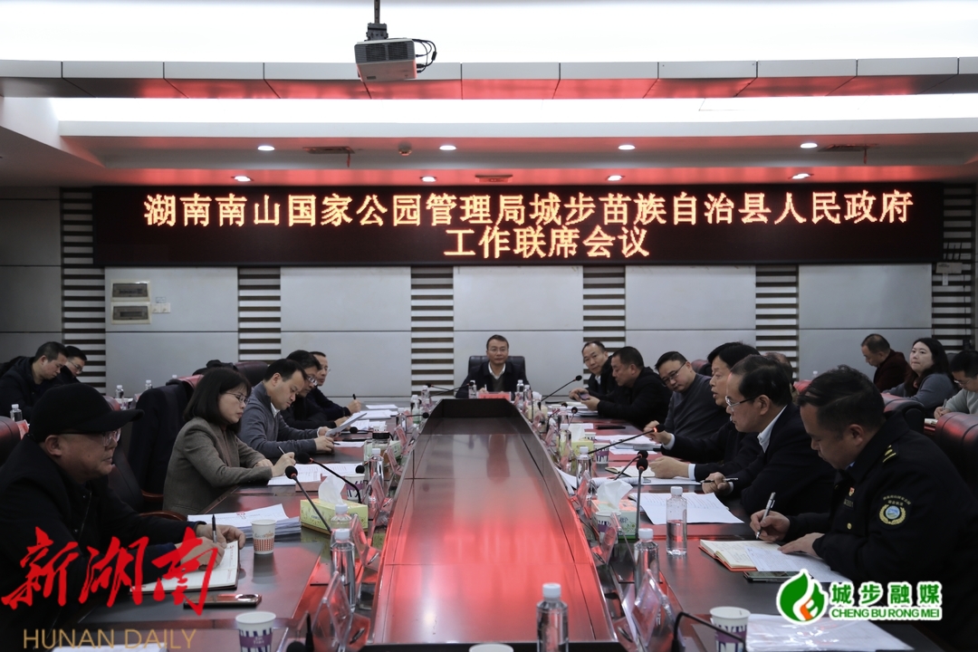 新城步客户端12月11日 (记者 王蕾婷)12月10日,湖南南山国家公园管理局与城步苗族自治县人民政府工作联席会议在县政府多媒体会议室召开,双方就进一步凝聚思想共识,携手推进当地生态环境保护和经济社会发展进行深入探讨与交流。南山国家公园管理局负责人周建宏,城步县委副书记、县长王慧敏出席会议并讲话。南山国家公园管理局党委副书记、副局长苏海,党委委员、副局长兼纪委书记戴求兵,县领导曾艺、马忠华、周祖德、杨辉刚,南山牧场党委书记、场长徐建国,南山国家公园管理局机关处室和直属单位相关负责人,以及县直相关部门单位和相关乡镇主要负责人参加。