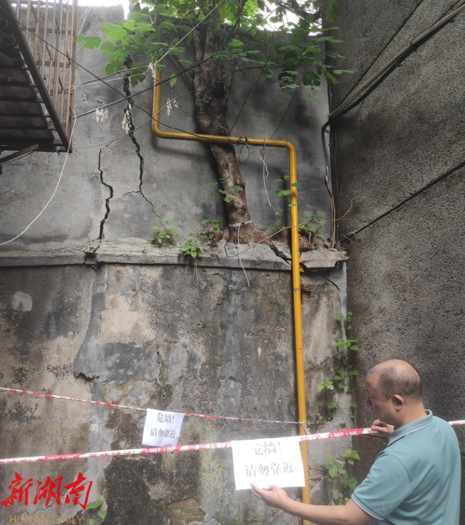前几日,网格员收到居民反映,明翰路47号的一处院墙存在安全隐患,与其有一墙之隔的另一处院落内一颗根系发达的树对该墙体造成挤压,树枝延伸至围墙上,导致墙体倾斜并逐渐开裂,出现严重变形,受损墙体面临着倒塌的危险。加上天然气管道穿墙而过,小区居民每日提心吊胆,生怕墙倒了砸到行人。