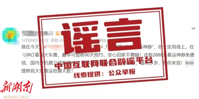 真相: 近日,某第三方平台发布“春运抢票开始”“最早可提前90天预约”等信息,引发关注。对此,铁路12306平台回应称,纯属平台营销炒作,与铁路12306平台无关。铁路12306平台是中国铁路面向社会提供互联网票务服务的唯一官方渠道,从未授权任何第三方平台发售火车票和办理火车票相关业务。