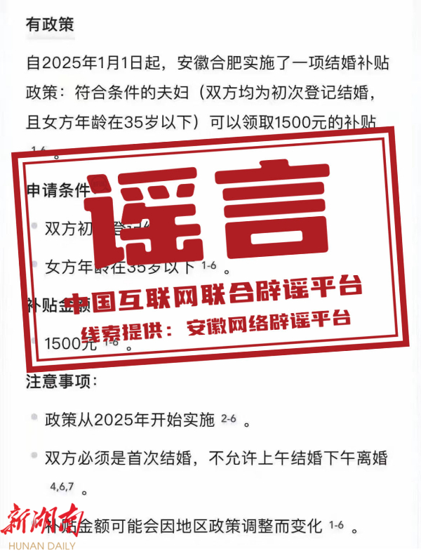 真相: 近日,有网民发布消息称“自2025年1月1日起,安徽合肥实施结婚补贴政策”“初次结婚登记可以领取1500元补贴”“下载相关APP即可领补贴款”,引发关注。对此,合肥市民政局发布声明称,网传消息为谣言。合肥市并未研究、出台有关结婚登记的补贴政策,望广大网民注意甄别。(来源:“安徽省互联网违法和不良信息举报”微信公众号)
