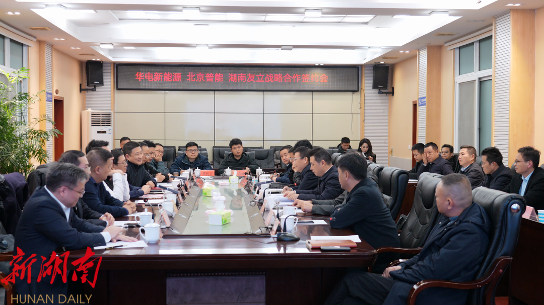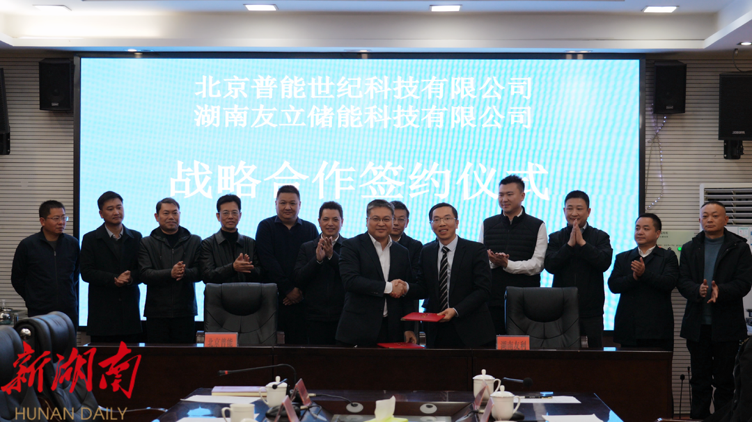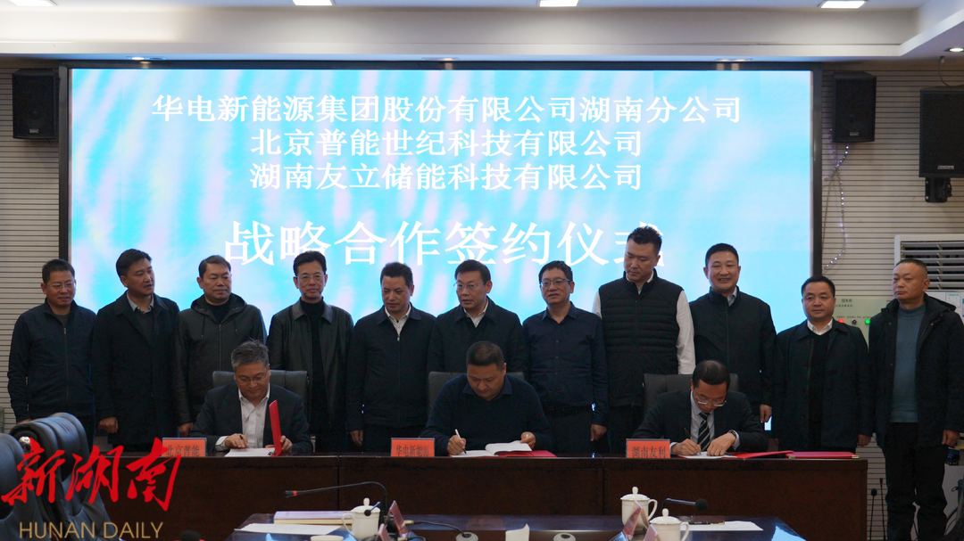新湖南客户端12月12日讯(记者 郑湘)12月11日晚,华电集团湖南分公司、北京普能能源科技有限公司与湖南友立储能科技有限公司在湘西土家族苗族自治州古丈县举行战略合作协议签订仪式,就10兆瓦时电池储能、高性能电解液等项目开展深入合作,推动区域产业结构优化升级,为高质量发展厚植绿色底色。湘西州副州长车世忠,中国华电集团湖南分公司副总经理朱芳政,北京友立集团董事长王正华,潞宝集团、北京普能公司董事长韩泽帅出席,县委书记滕朝辉主持签约仪式。