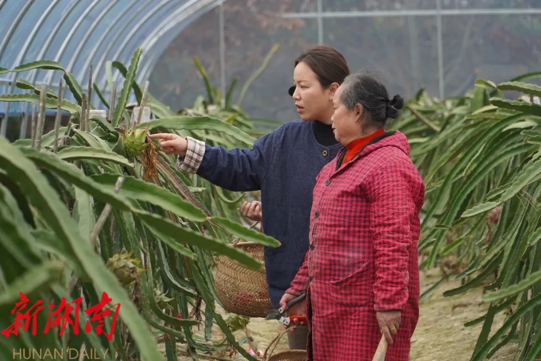 湖南日报·新湖南客户端12月13日讯(记者 解雯惠) 初冬时节,走进永定区新桥镇米多农场的火龙果种植大棚,紫红色的果实挂在枝头,色泽鲜艳、果形饱满,让人垂涎欲滴。区第八届政协委员、农场负责人龚乔正提着筐、拿着剪刀,采摘成熟的火龙果。