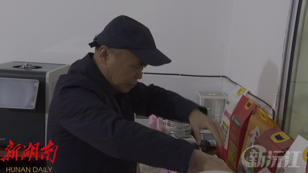 来到沅江市草尾镇现代农业技术研发基地,程乐根正在一袋袋大米之间仔细观察,对比不同品种之间的差别,然后根据外观、色泽、气味等综合特征,将大米按照品质进行分类摆放。