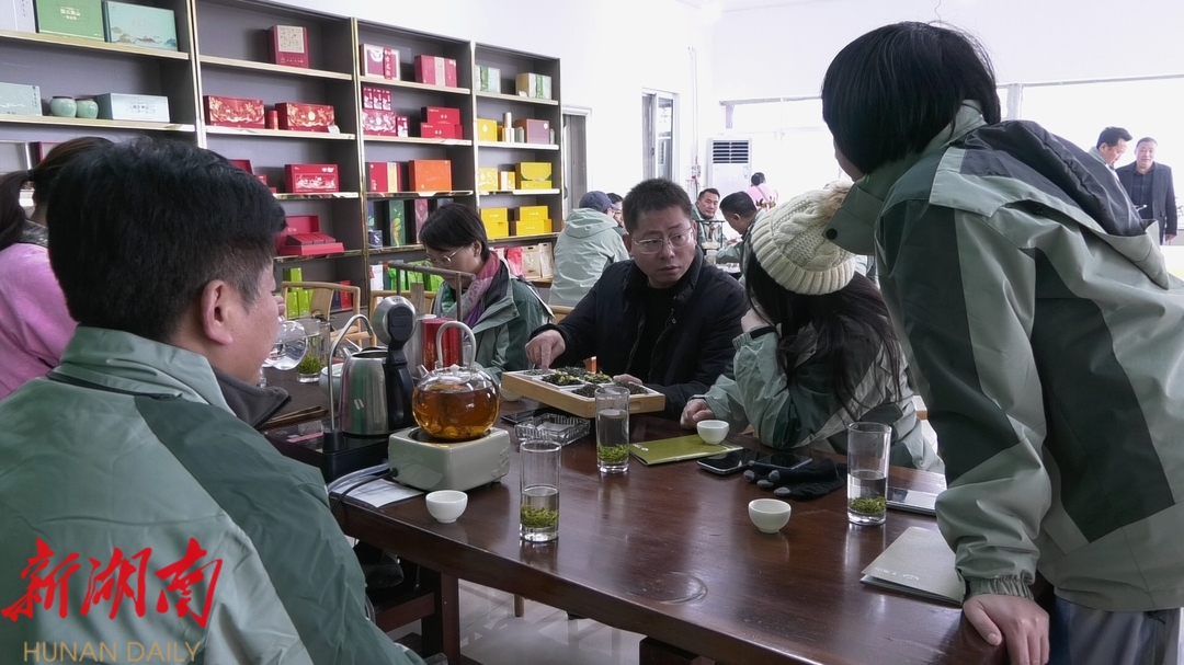 随后,采风团来到牛角山生态有机茶园参观,登上观景台远眺,云雾缭绕、绿意盎然、如诗如画的美景映入眼帘,茶香四溢令人心旷神怡,也引得文艺家们纷纷拿起手机、相机记录。全国人大代表龙献文介绍了走文旅融合、茶旅融合路子带领村民实施乡村振兴的先进经验,牛角山生态农业科技开发公司是农业产业化国家重点龙头企业,有13800多亩高标准高山茶园,2023年实现茶旅营收1.9亿元,并带动周边20000多户茶农增收。接着,文艺家们到茶室里围坐在一起品茗,对古丈毛尖赞不绝口,它色泽翠绿、汤色黄绿明亮、滋味醇爽、回味绵甜悠长。