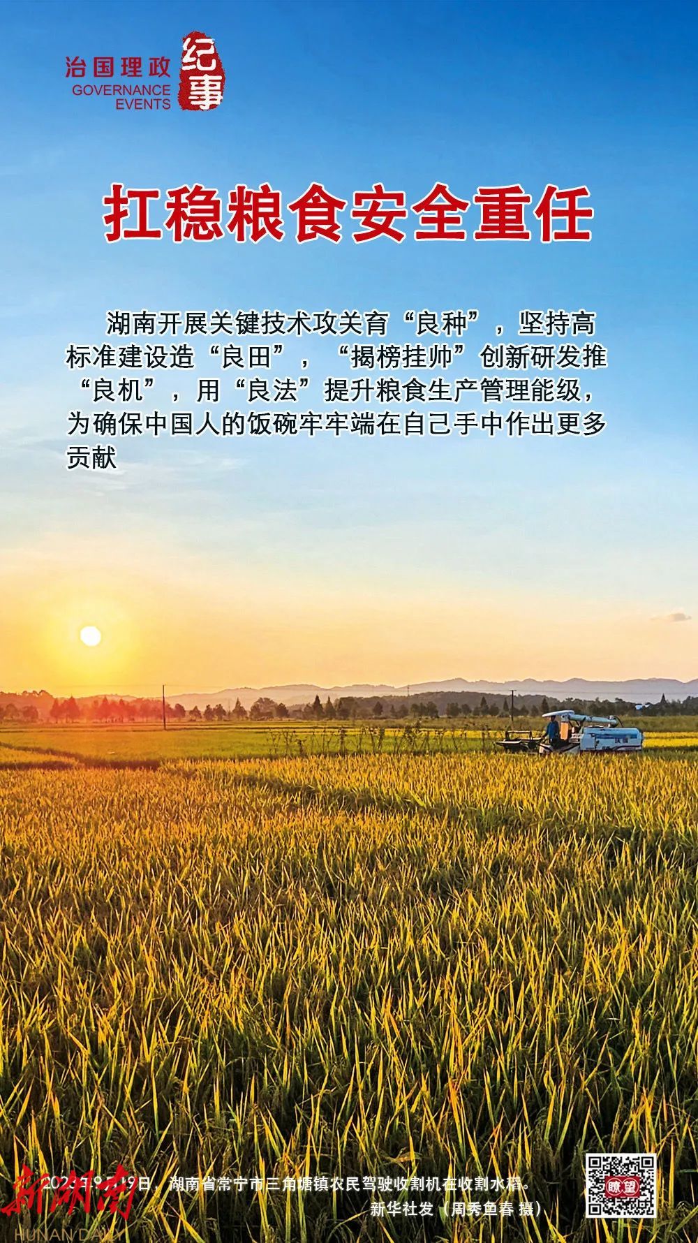 湖南省委书记沈晓明表示,湖南坚决扛牢维护国家粮食安全重任,全面落实粮食安全党政同责,加强良田良种、良机良法配套,为确保中国人的饭碗牢牢端在自己手中作出更多贡献。