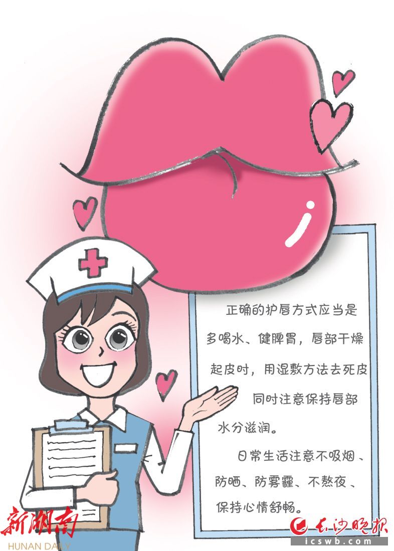 “由于嘴唇没有皮脂腺,不分泌油脂,碰上干燥寒冷的天气,加上风吹日晒,如果不注意润唇,或是有舔嘴唇的习惯,就会加速嘴唇起皮。”吴志强提醒,正确的护唇方式应当是多喝水、健脾胃,当唇部干燥起皮时,用湿敷方法去除死皮,同时注意保持唇部滋润。