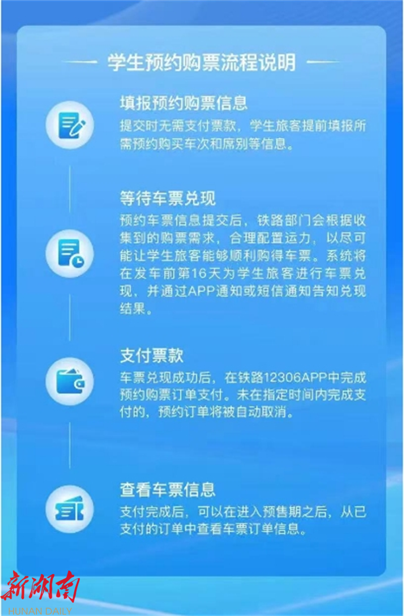 湖南日报·新湖南客户端12月15日讯(通讯员 周昱君) 为做好2025年寒假期间各大院校学生离校及节后返校的车票发售工作,铁路部门于2024年12月12日至2025年2月12日,开通学生预约购票专项服务。