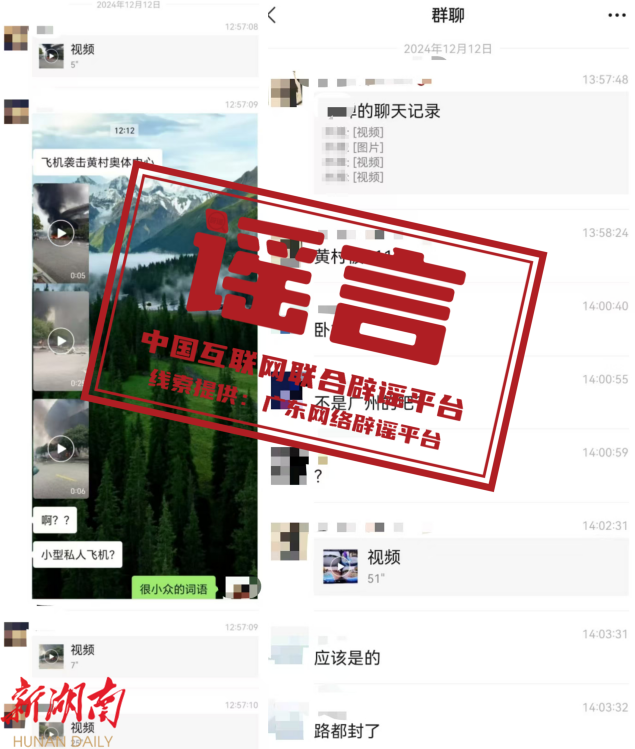 真相: 12月12日,网传“位于广州黄村的广东奥林匹克体育运动中心发生飞机坠落事件”,引发关注。网传视频显示,飞机从高空坠落,撞击一座建筑物后燃起熊熊大火,网传聊天记录称“飞机袭击黄村奥体中心”“已经封路”,聊天记录中所附某地图软件截图显示,广东奥林匹克体育场附近有多处道路被封。经记者核实,该传言为谣言。广东奥体中心工作人员表示,广东奥林匹克体育运动中心一切如常,并无异样,道路封闭是因为奥体中心正在进行场馆翻新建设工作。此外,经查询,上述网传视频发生于湖北省荆州市经开区某地。据湖北荆州经开区管委会微信公众号发布情况通报称,12日11时10分许,某公司在测试固定翼无人机过程中,无人机失控撞向建筑物后起火。目前火势已扑灭,一名伤者正在全力救治。(来源:“广东省互联网举报中心”微信公众号、南方网、粤学习App)
