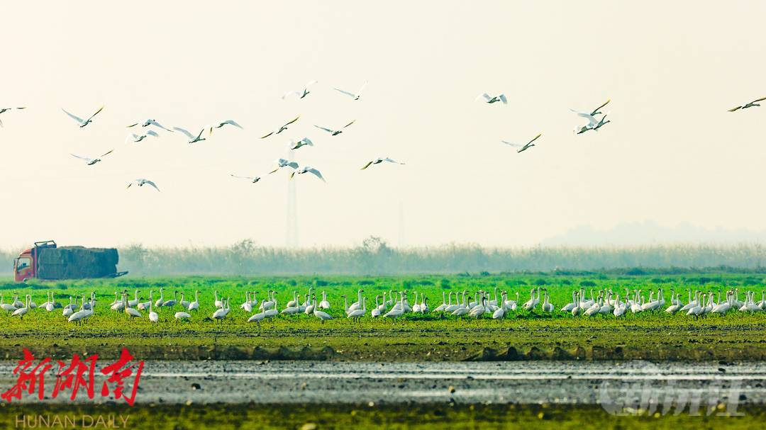 新沅江客户端12月16日讯 (记者 钟祖彪 李咏澎)冬日的南洞庭湖一片宁静。12月6日下午4时30分左右,环保志愿者张健雄骑着摩托车来到一个叫做团湖子的地方。夏天,这里洪波涌起,大湖壮观,而现在则是一派苍翠,湖草覆盖着辽阔的湖洲,成千上万的各类候鸟聚集在这里,它们时而低头觅食,时而成群结队地跃上天空。