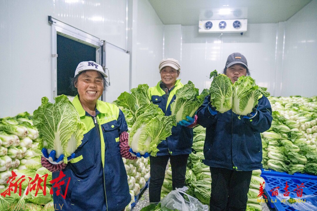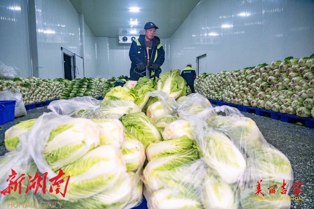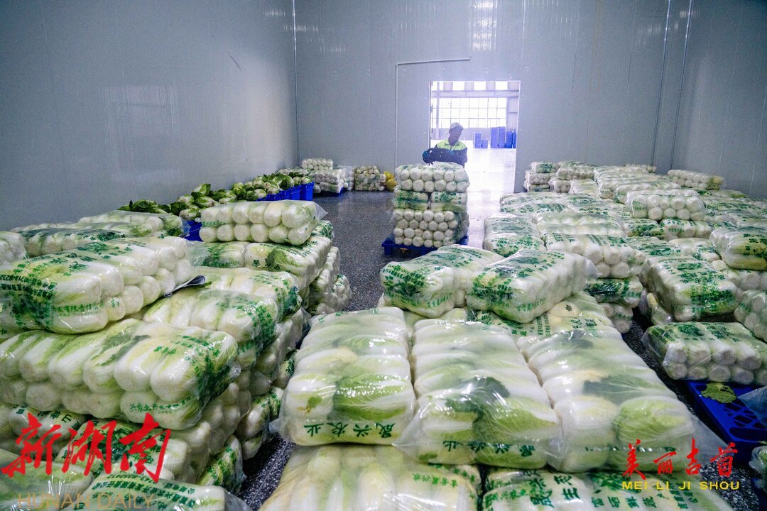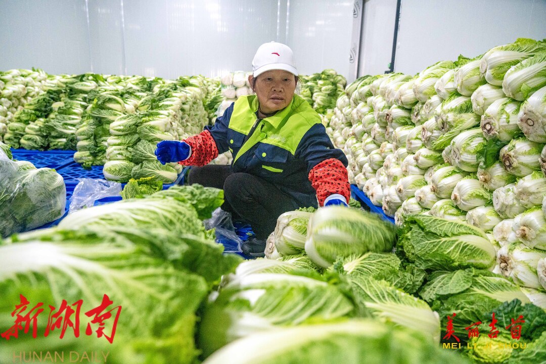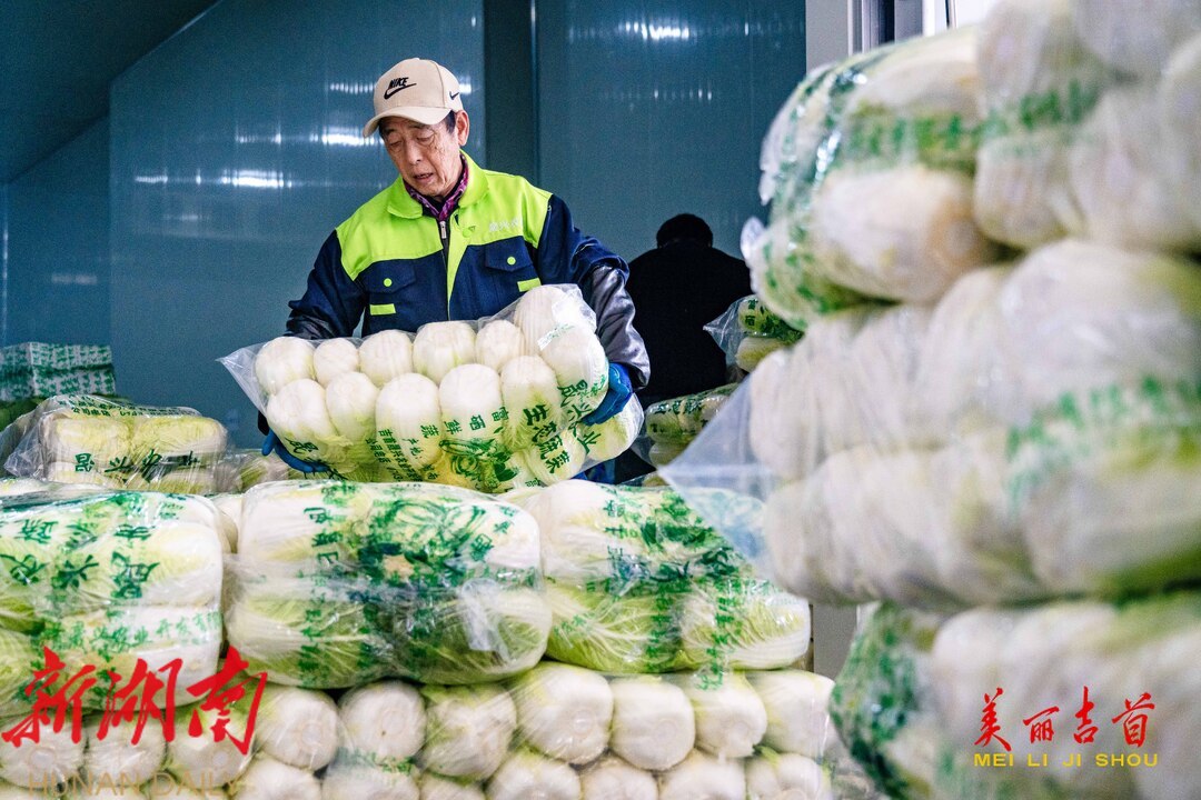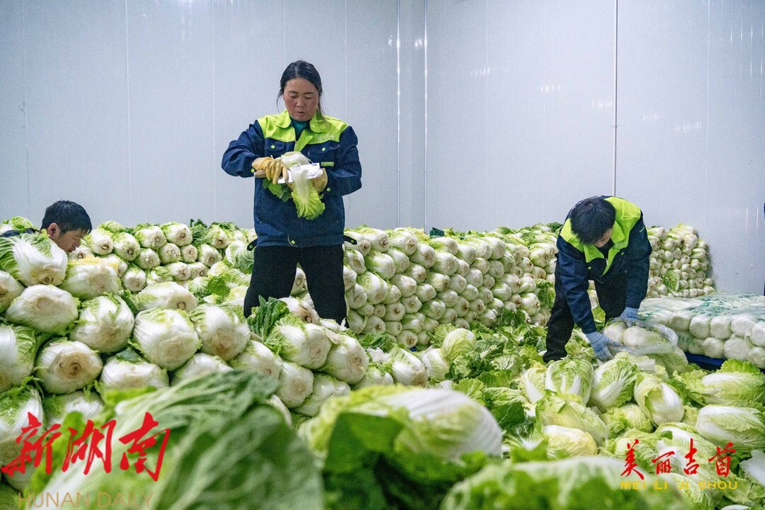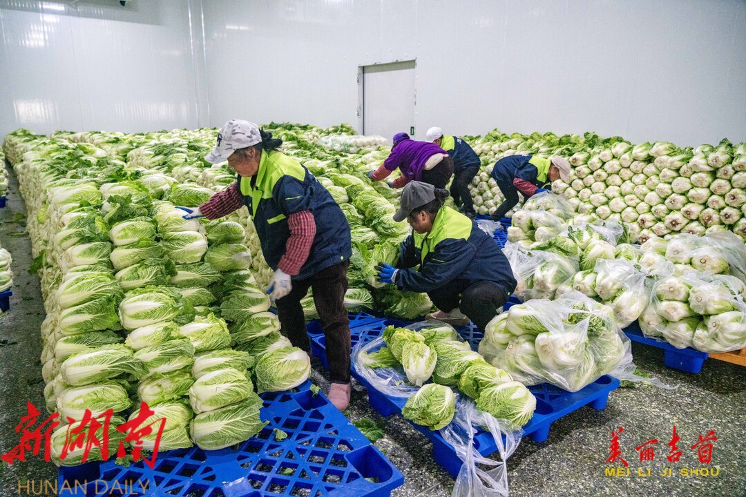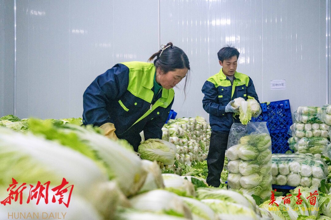 12月15日,吉首市乾州街道西门口村,工人在晟兴农业开发有限责任公司蔬菜仓储冷链中心忙着对订单白菜进行分拣、包装、搬运,供应市场。今年,该市11个乡镇(街道)与晟兴农业签订白菜、螺丝椒、土豆、南瓜等订单蔬菜种植,供应粤港澳大湾区等地。依托订单农业,该市不断调产业、优结构,以农业产业化推动乡村振兴,持续带动农业增效、农民增收。