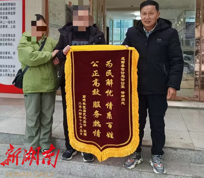新湖南客户端12月13日讯(通讯员 吴君)12月12日上午,范某某老人家属 将写有“为民解忧,情系百姓,公正高效服务热情”字样的锦旗送到县信访局,感谢信访局和政法“五老”调解工作人员成功为其处理矛盾纠纷。