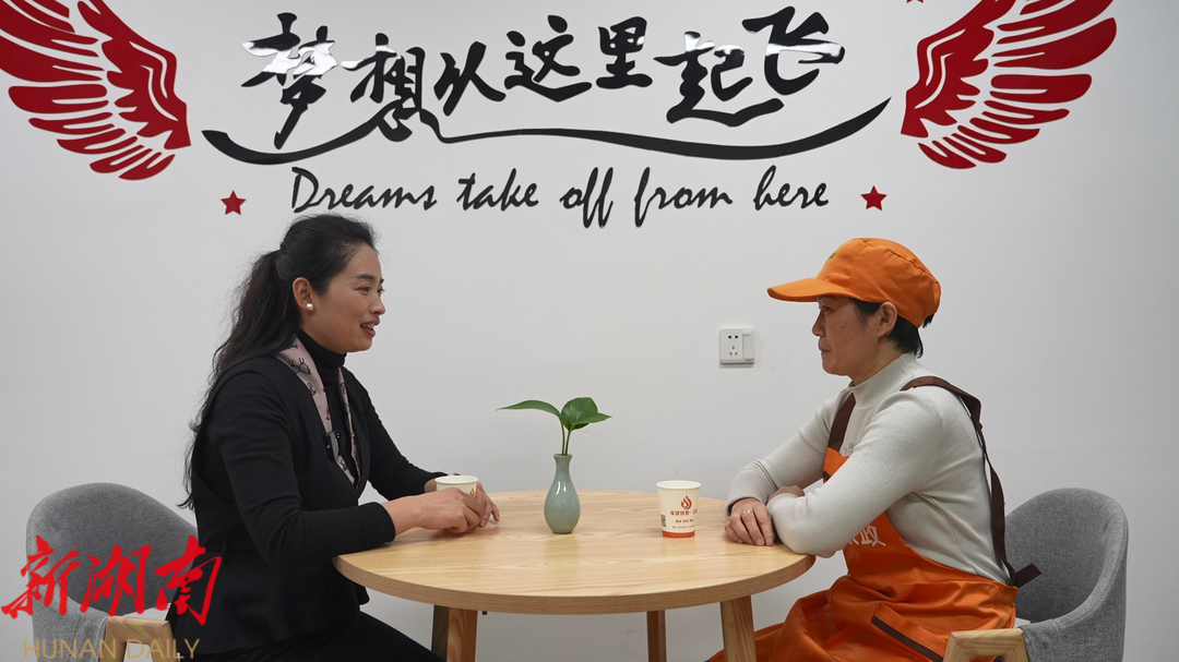 在“福城银嫂”委员工作室,郭素珊正在热情地询问福州返乡就业人员危金凤的就业感受,并详细记录她在工作中遇到的困难,以便为永兴籍家政人员提供更有针对性的服务。