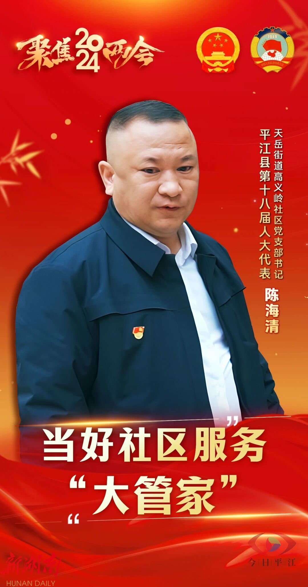 人大代表陈海清是天岳街道高义岭社区的党支部书记。他建议政府对已建成的高层住宅小区逐步进行二次供水设施改造,全面提升居民饮水质量。