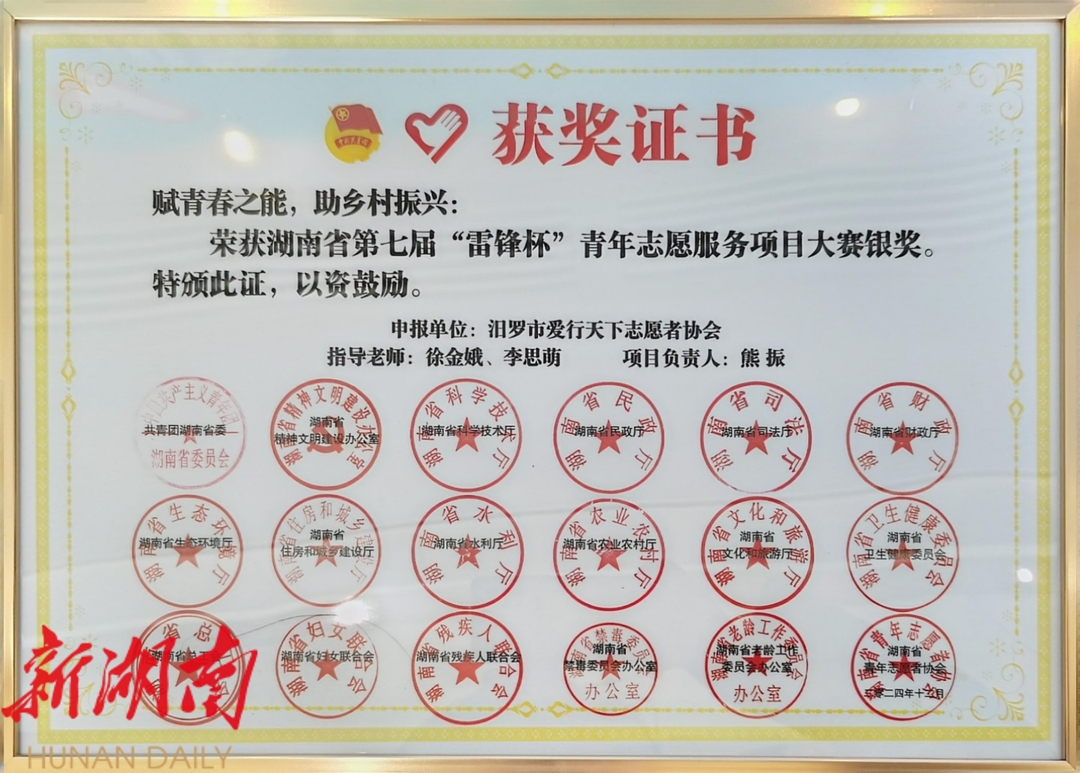 湖南日报·新湖南客户端12月19日讯(通讯员 胡清)在湖南省第七届“雷锋杯”青年志愿服务项目大赛的激烈角逐中,汨罗市爱行天下志愿者协会凭借《赋青春之能,助乡村振兴》项目荣获银奖。