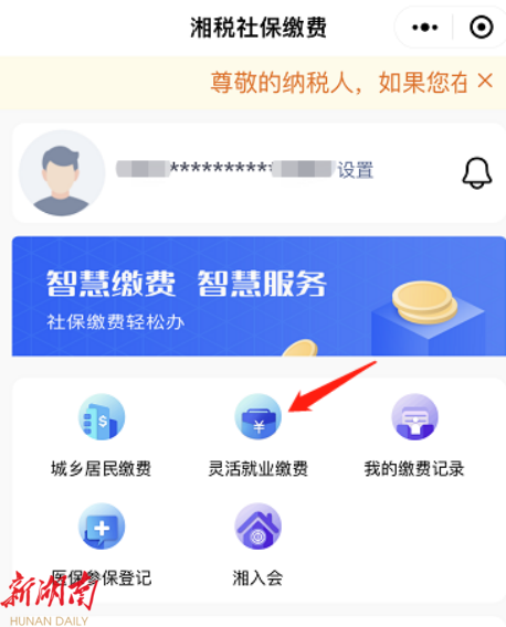 ①长按识别二维码进入湘税社保微信小程序后,在首页选择“灵活就业缴费”。