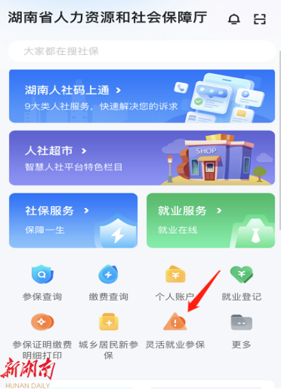 1.下载安装“智慧人社APP”或微信搜索“智慧人社”公众号,按提示完成注册及实名认证,登录后在首页选择灵活就业参保选项(参保地选衡阳县)。