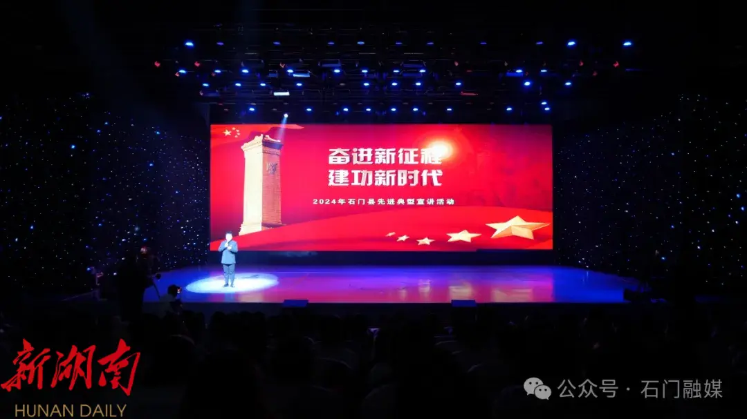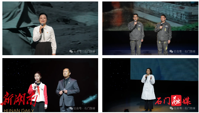 宣讲活动以“理想如炬 改天换地”“不负人民 战天斗地”“复兴强国 感天动地”三个篇章展开。活动中,周泽灯、刘一嬛父女讲述了石门可歌可泣的红色历史故事。姚龙、王澜讲述了王尔琢的故事。潘桢讲述了石门儿女战天地、斗鬼神,靠勤劳、智慧创造出历史奇迹的建设故事。覃道周、田家赐讲述了竭力为人民群众办实事、解难题的“电骡子”故事。邓付勇分享了湘佳股份有限公司董事长喻自文靠养鸡起家,30年来一步一个脚印奋力拼搏实现弯道超越,成为推动石门高质量发展的生力军的故事。葛相刚讲述29年扎根山区教学育人,无怨无悔的故事。邓慧萍讲述坚持“以患者为中心”,用实际行动诠释了仁心与大爱、温情与力量、责任与担当的新时代卫生健康职业精神。活动还分享了县城管执法局派驻南北镇薛家村第一书记、工作队长易先辉与妻子扎根乡村振兴第一线的感人故事。整个活动气氛热烈,赢得阵阵掌声。