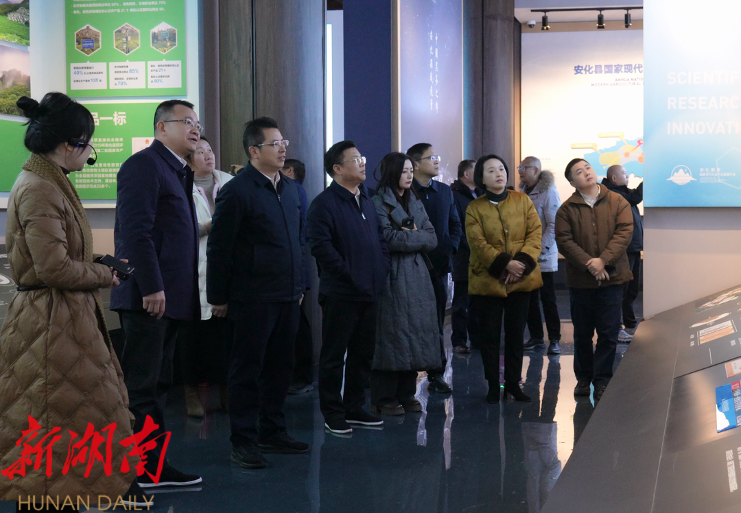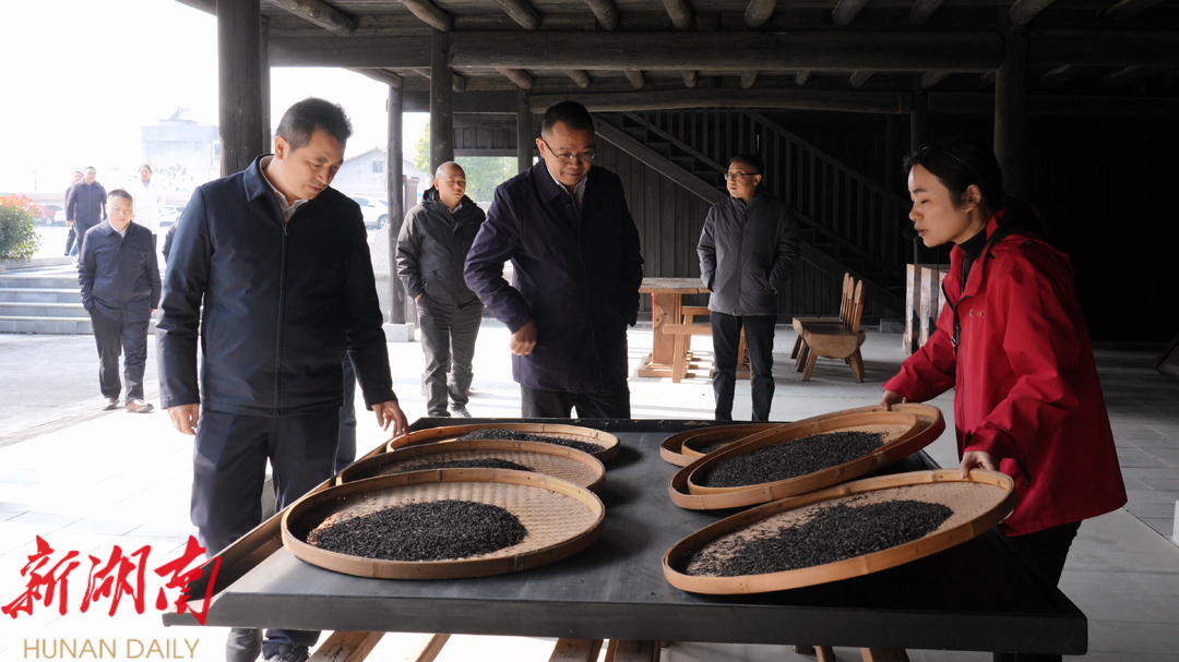在安化,黑茶是名副其实的 “黄金茶”,全县茶园 36 万亩、综合产值 252 亿元,拥有大小茶企 210 余家。滕朝辉一行先后来到万隆黑茶产业园、安化黑茶国家现代农业产业园成果展示馆、安化黑茶文化艺术馆、茶乡花海生态文化体验园等地,考察学习茶叶机械化、数字赋能、茶旅融合、现代营销等工作经验,实地感受安化黑茶的发展成效。在万隆黑茶产业园, 13 条全自动流水生产线有条不紊地进行着茶叶烘焙、筛选等程序,每年可生产各类黑茶产品 2.5 万吨。安化黑茶文化艺术馆是集观光、黑茶制作体验、安化黑茶产业集群工业互联网、茶文化传播等于一体的茶旅综合博览馆,每年吸引省内外超 2 万游客前来打卡,滕朝辉一行详细参观了博物馆内的各个展厅,了解黑茶制作的全过程,感受黑茶的独特魅力。