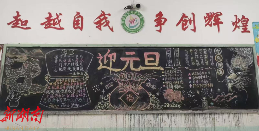 活动中,各班积极参与“庆元旦”主题黑板报大赛,学生们纷纷拿起粉笔,充分发挥想象,将黑板报打造得各具特色、精彩纷呈。一幅幅设计新颖、内容丰富的黑板报不仅展示了学生们的才艺,更传递了大家对新年的美好祝愿。此外,全体师生还齐聚操场,举行“辞旧迎新,喜迎元旦”主题升旗活动。在庄严的国旗下,学生代表发表了激情洋溢的演讲,表达了对过去一年的回顾和对新年的憧憬。