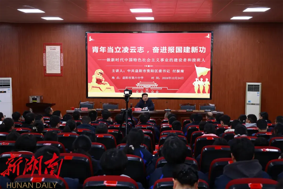 12月24日,区委书记付振南走进益阳市第六中学,以“青年当立凌云志,奋进报国建新功”为主题,为广大师生讲授了一堂精彩生动的思政课。区领导李良兵、曾国栋、刘作恒参加。