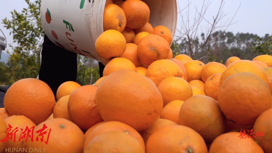 走进南岸村何曾良的家庭农场果园,金黄的橘子挂满枝头,果农们趁着晴好天气,穿梭在果树间进行采摘工作。