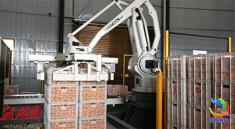 走进水果分选车间,一台长达110米的大型水果光电无损智能机映入眼帘,在分选机传送带上,源源不断的冰糖橙整齐排列,犹如等待检阅的士兵。这台分选机采用了最前沿的光学检测和智能算法技术,能够在0.1秒内,精准地对每一个冰糖橙进行全方位的“扫描”,当冰糖橙经过分选机的检测区域时,高清摄像头迅速捕捉果实的外观图像,包括色泽、形状和表面瑕疵等信息。而另一边,在水果投放前端,一只巨大的机械手臂一次性可抓起4筐冰糖橙投入到分选设备里面,极大地缩短了投放时间和人力成本。