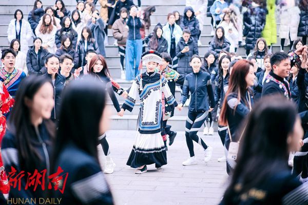 活动中,佳丽们亲身体验土家族的传统文化——摆手舞。随着欢快的音乐响起,她们与魅力湘西演员一起翩翩起舞,展现了传统与现代交织的独特韵味。