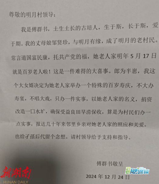 湖南日报·新湖南客户端12月26日讯(通讯员 李子耀)12月24日,一份特别的“报告”被送入汨罗古培镇南环村村民委员会的办公室。这份报告不是寻常的反映问题,而是报告人想用一个特殊的方式为自己的丈母娘办一个特别的“寿宴”。