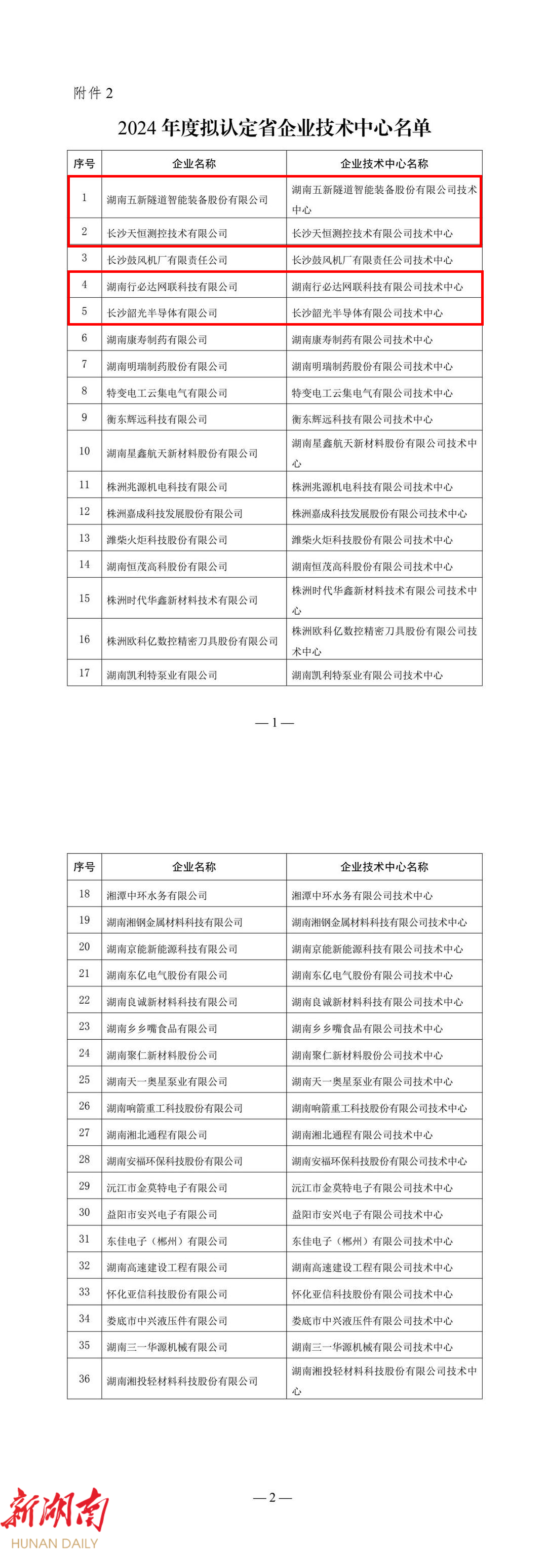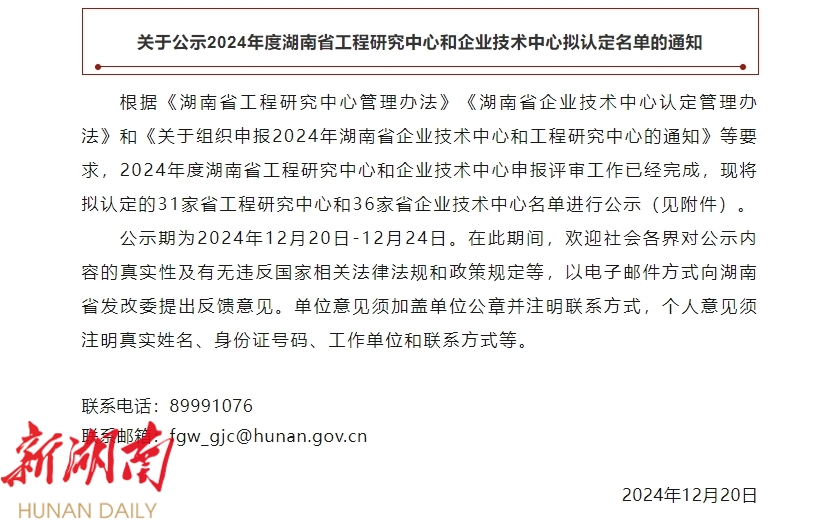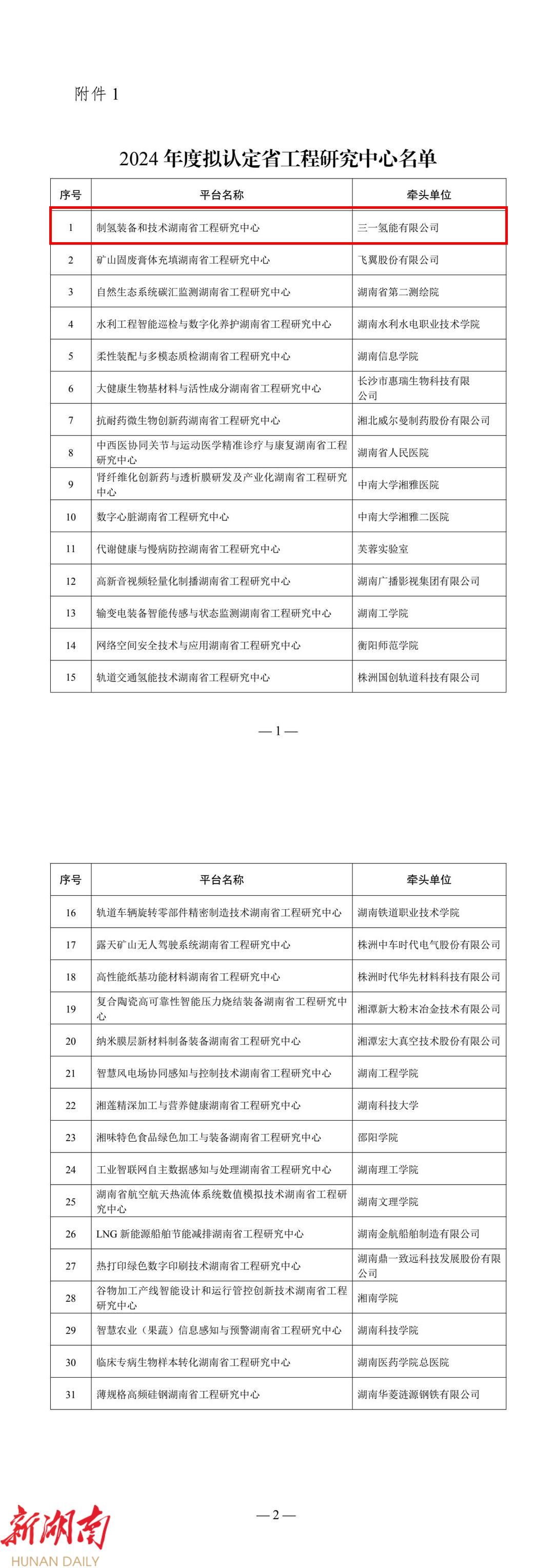 湖南日报·新湖南客户端12月23日讯(长沙经开区工作站记者 刘鑫宇) 近日,湖南省发改委将拟认定的31家省工程研究中心和36家省企业技术中心名单进行公示,长沙经开区共5家企业入选,包括制氢装备和技术湖南省工程研究中心(三一氢能有限公司),4家企业技术中心(湖南五新隧道智能装备股份有限公司技术中心、长沙天恒测控技术有限公司技术中心、湖南行必达网联科技有限公司技术中心、长沙韶光半导体有限公司技术中心)。