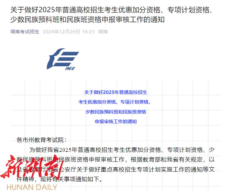 哪些考生可以享受高考优惠加分?报考专项计划有什么条件?少数民族预科班、民族班怎么申报? 12 月 25 日,湖南省教育考试院下发有关事项通知,对上述问题进行了明确。