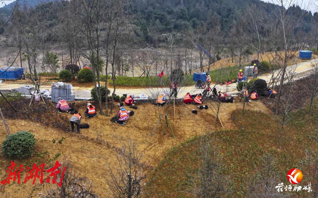 12月25日,在“锰三角”湖南花垣古苗河国家湿地公园湿地保护与修复项目现场,工人们一边操作挖掘机忙着铺垫砂石、平整路面,一边忙着搬运绿植,挥舞锄头栽种绿植,现场一派繁忙景象。
