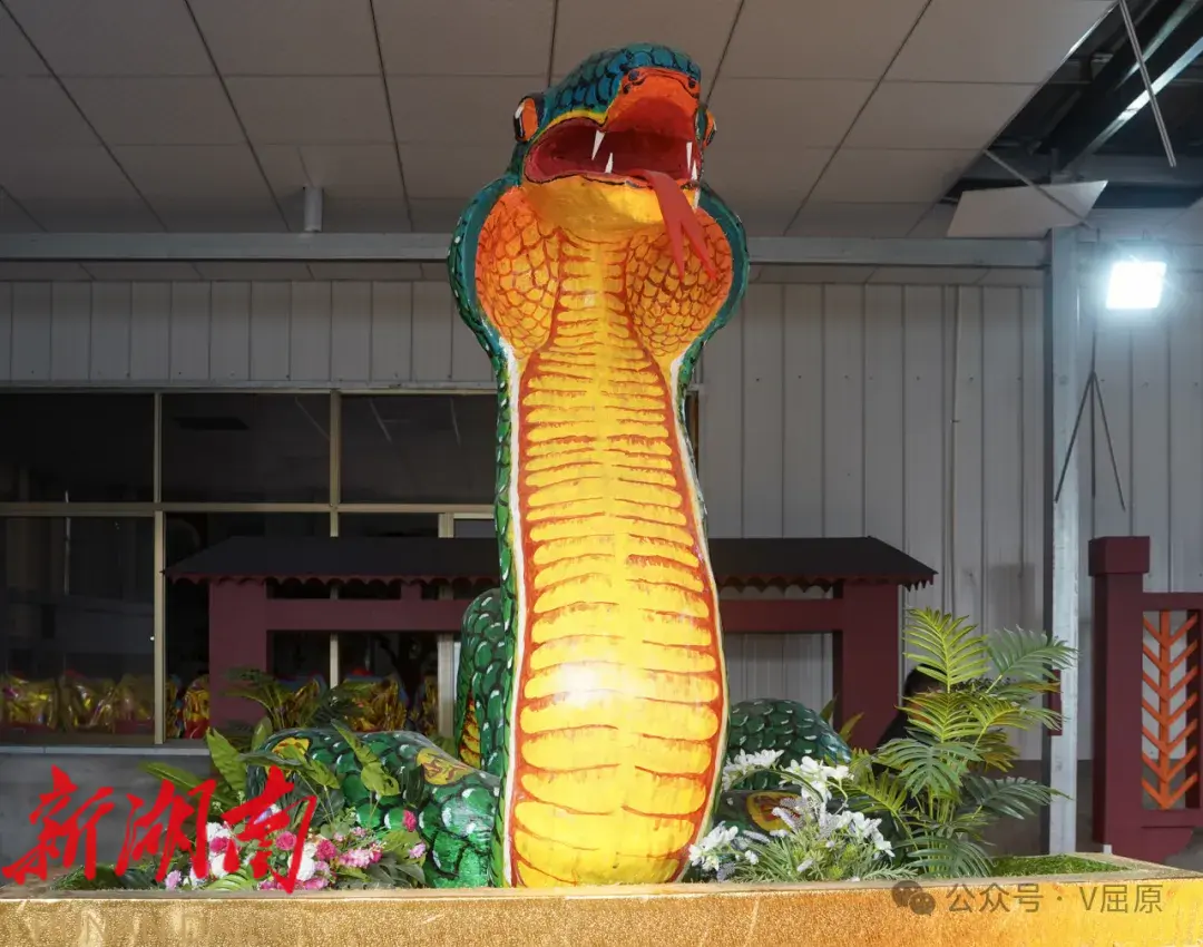 此次灯会造型设计围绕蛇年主题,大型蛇形雕塑组是此次灯会的焦点。福蛇迎春,蛇年吉祥两组雕塑,身姿蜿蜒灵动。六名制作工匠专注投入,耗费15天完成了两条栩栩如生的福蛇,带领大家开启吉祥的蛇年。还有一系列富有民俗寓意的大型组件也在同步制作中。民俗方阵的渔翁戏蚌、大头戏柳、彩龙船,花车方阵(历史人物队列)的屈原(橘颂书香)、芈月(故里情怀)、岳飞(精忠报国),台故事方阵的天女散花、麻姑献寿、苏武牧羊,摆龙方阵的大摆龙、彩带龙......均已完成制作。