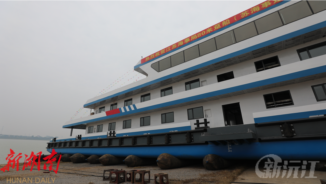 新沅江客户端12月30日讯 (记者 钟祖彪 邹凯)12月24日,江苏海事局“苏海事趸80号”趸船簇新锃亮,彩旗飘扬,自湖南省沅江市金航船舶公司造船车间平稳滑行至南洞庭湖中。