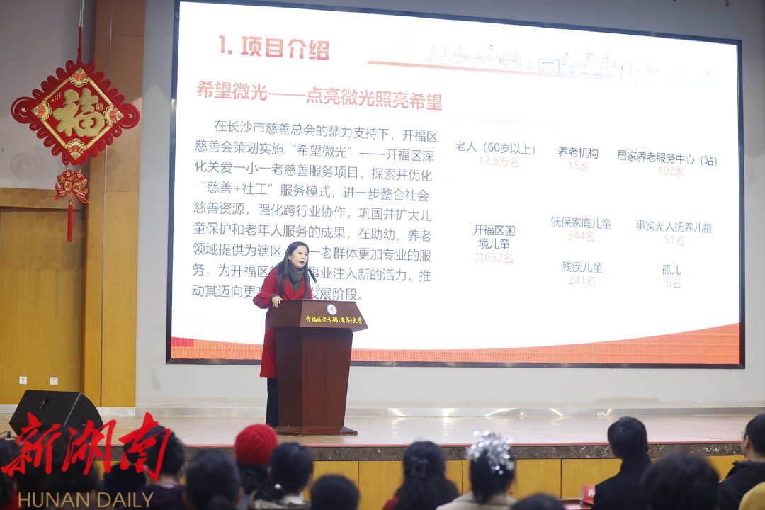 开福区民政局副局长刘玄代表开福区慈善会,详细介绍和分享了“希望微光”公益项目情况和后续工作计划。现场,开福区老干部(老年)大学与开福区慈善会进行公益慈善结对共建,并举行基层社会治理共建项目启动仪式,在2025年依托“希望微光”品牌项目,推动益老益小公益服务走基层、进社区,为开福区创新社会治理发展贡献新的力量。