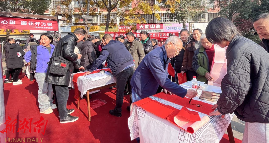 值得一提的是,社区特别邀请了湖南省书法家协会刘绮国副教授、中国书法家协会王勇老师、墨联散曲家郭承志老师以及墨联散曲家李文勇老师现场挥毫泼墨。四位书法家为到场的居民群众书写新年祝福,一幅幅红彤彤的春联不仅寄托了人们对新年的美好祝愿,也传承了中华民族的优秀传统文化。