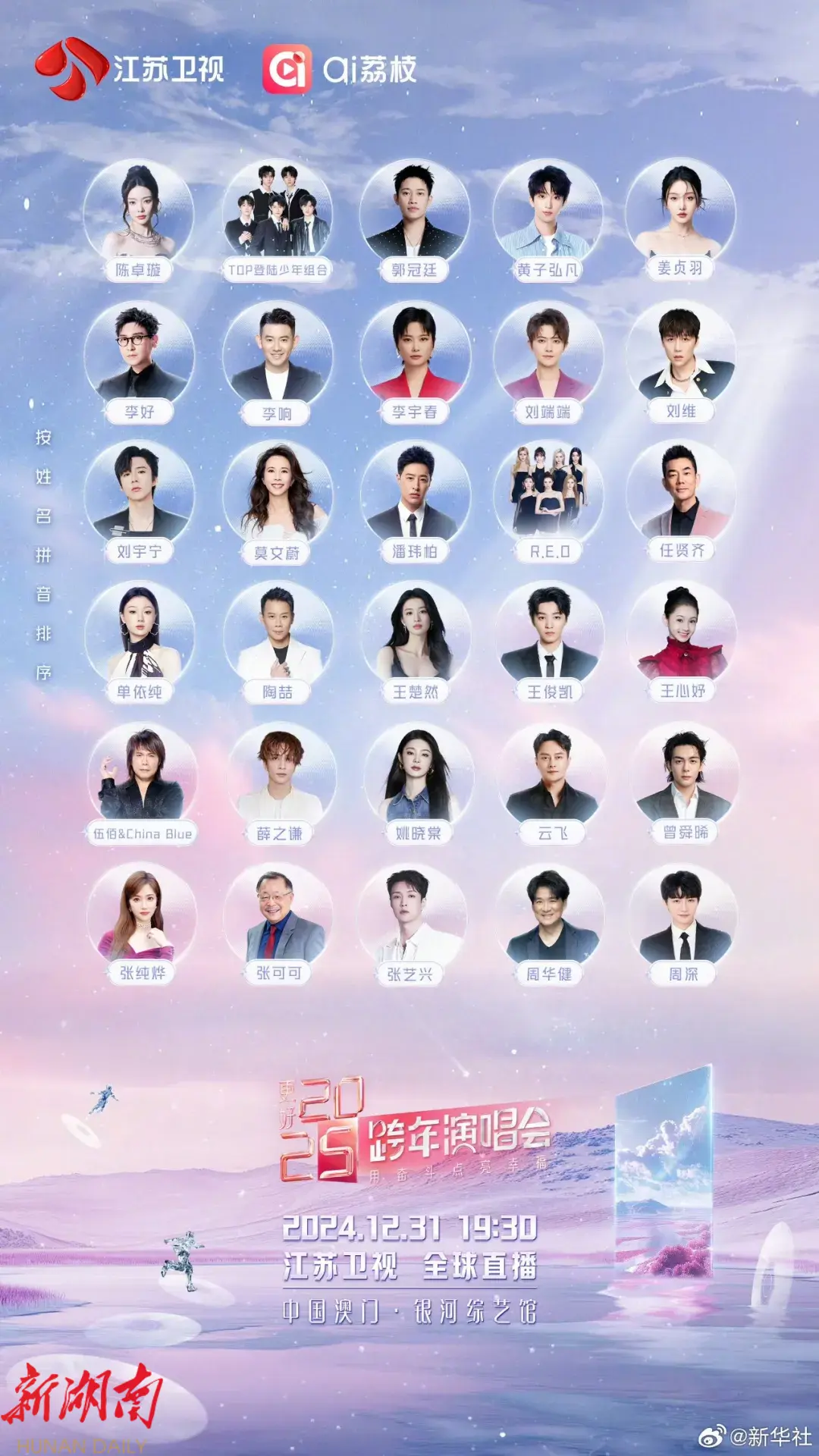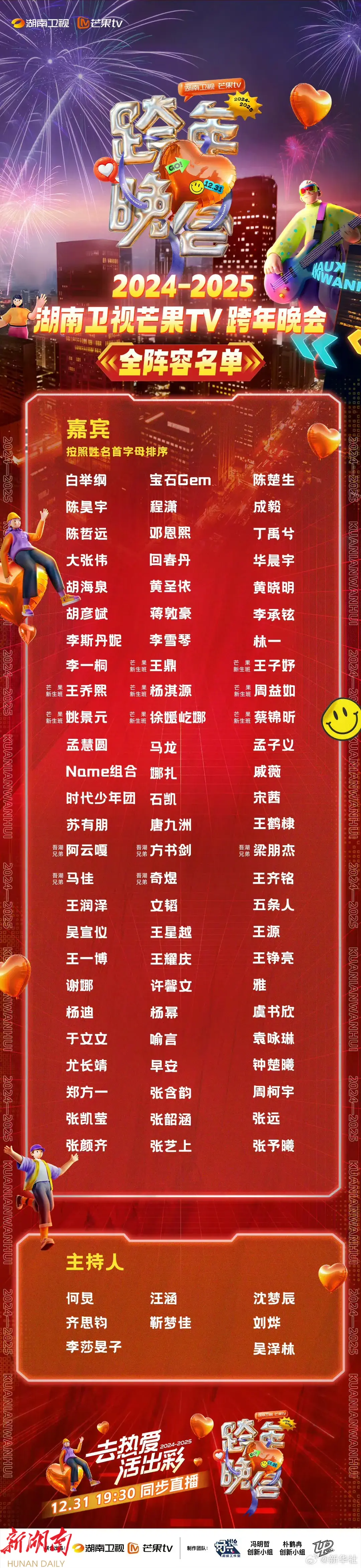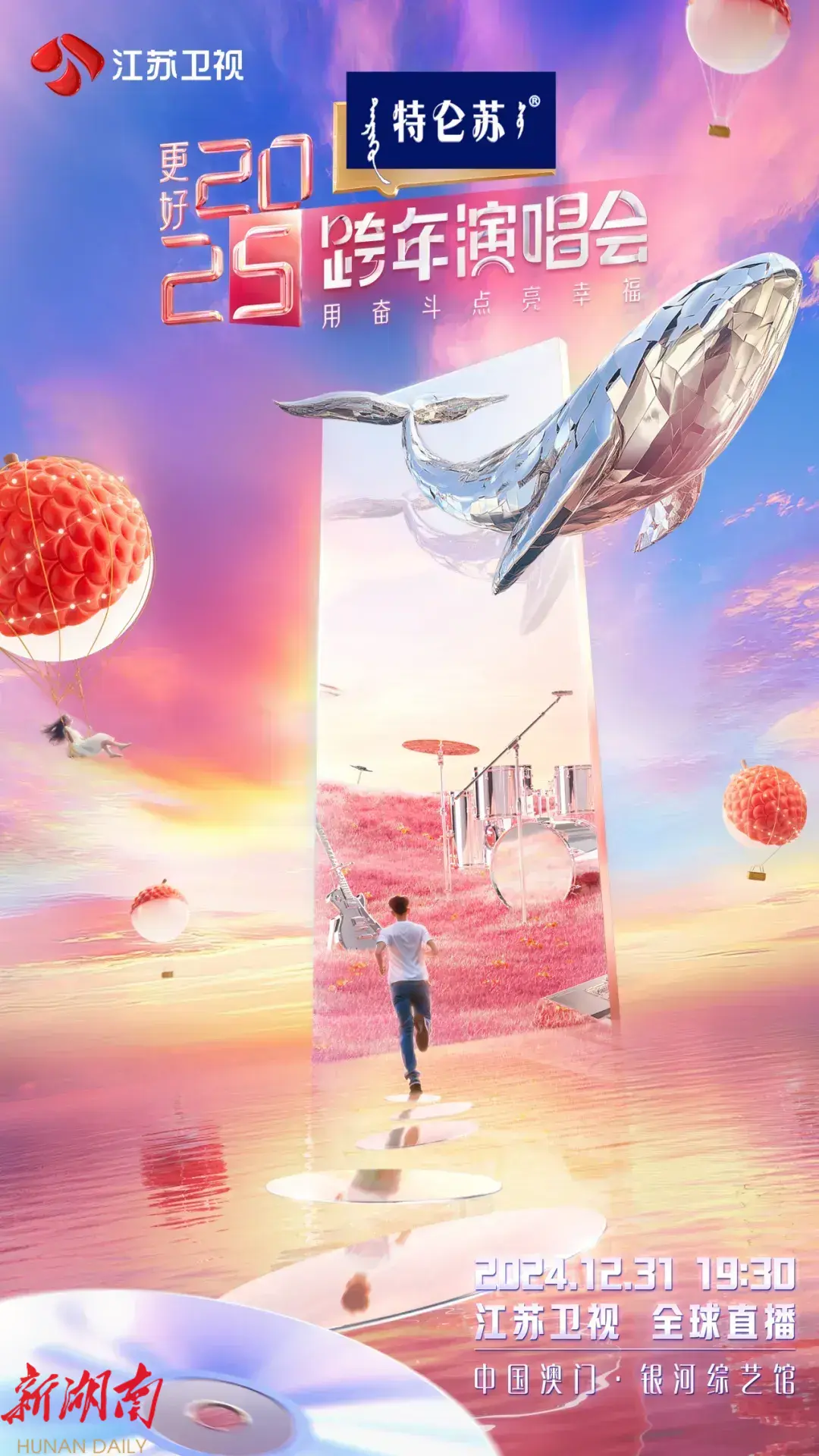 晚会介绍 :湖南卫视的跨年晚会将于2024年12月31日19:30在海口五源河体育馆举办,今年是湖南卫视跨年晚会陪伴观众的第20个年头晚会以“去热爱,活出彩”为主题,融合派对、街区、歌舞、直播、创新科技等元素,邀请60+组艺人嘉宾创新组合,多维度诠释青春面貌与年轻态度,打造一场有温度、有生活、有潮流感的跨年仪式。