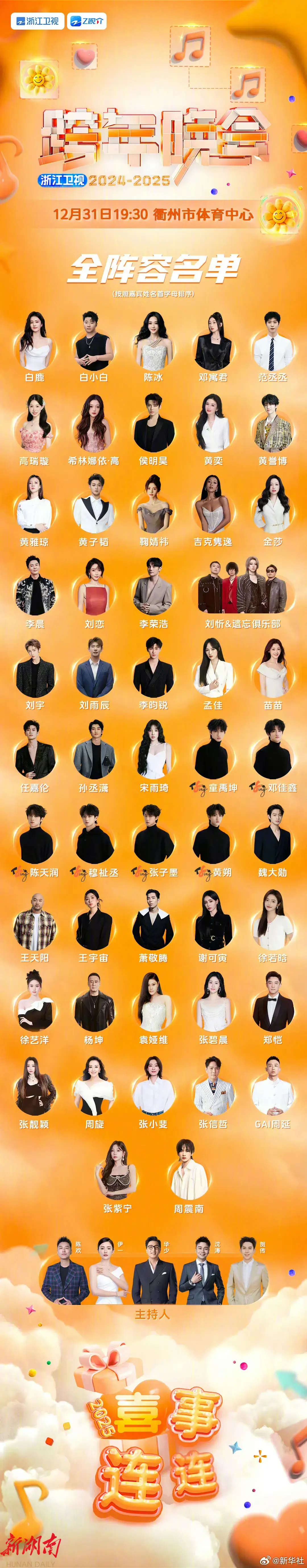 晚会介绍 :浙江卫视的跨年演唱会再次落户衢州将于2024年12月31日19:30在浙江省衢州市体育中心举办,本次跨年晚会将以“2025喜事连连”为主题,通过丰富多彩的节目,传递积极向上的价值观,在主题设置上主打“搭子”概念,向社会各界传递陪伴与归属、轻松与自由、探索与成长的情绪价值。