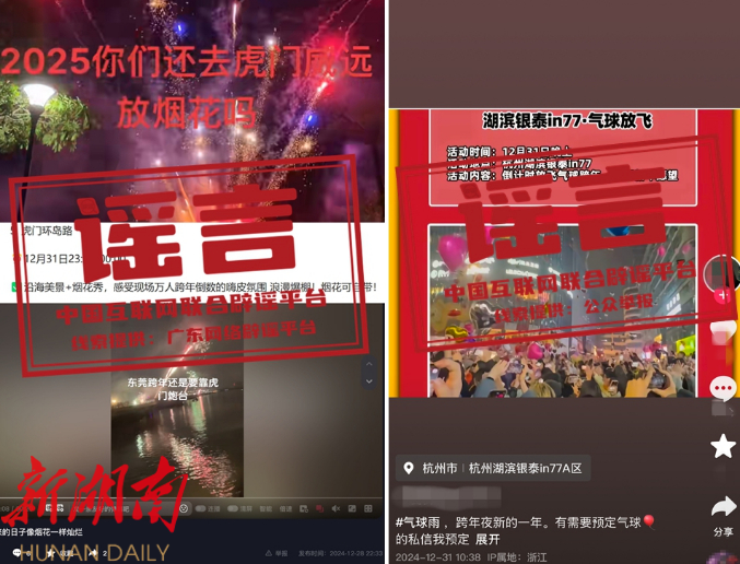此前,网上还曾出现“广东惠州双月湾将举办跨年夜烟花秀”等信息,相关部门已辟谣。(相关辟谣信息请见:今日辟谣(2024年12月23日) )