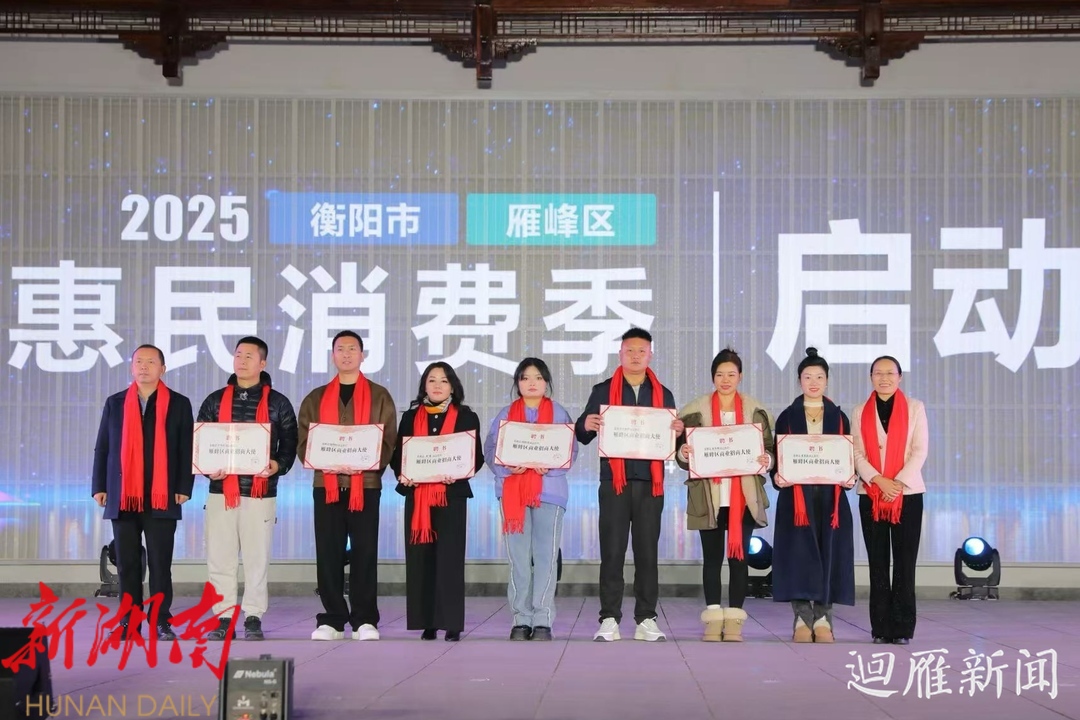惠民消费节启动仪式上,领导嘉宾为获得省级便民生活圈的社区颁发了荣誉证书,为商业招商大使颁发了聘书。现场雁峰区携手大洋百货、苏宁电器等商业综合体,白沙苑、外婆桥等餐饮老店,以及雁农鲜生、奥晟商贸等企业,推出10元—100元面额不等的消费券,打造“吃喝玩乐游购行”一站式消费体验,让雁峰的夜晚“亮”起来、美食的味道“飘”起来、商圈的人气“热”起来、惠民消费季“红”起来。