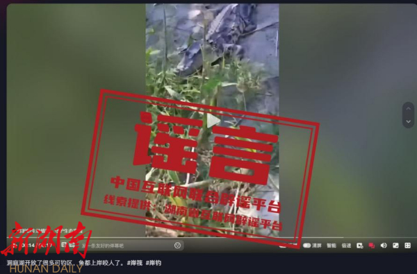 真相: 近日,一则内容为“洞庭湖可钓区发现鳄鱼”的短视频在网上传播,引发网民关注。经湖南省岳阳市网信、公安部门联合查证,视频画面系2024年6月武汉长江段发现鳄鱼的事件,当地已发布事件通报。视频发布者胡某某为吸引眼球、博取流量,擅自将其标注为“洞庭湖可钓区”,造成网民误解。公安机关已依法对胡某某进行批评教育。(来源:“湖南省互联网举报中心”微信公众号)