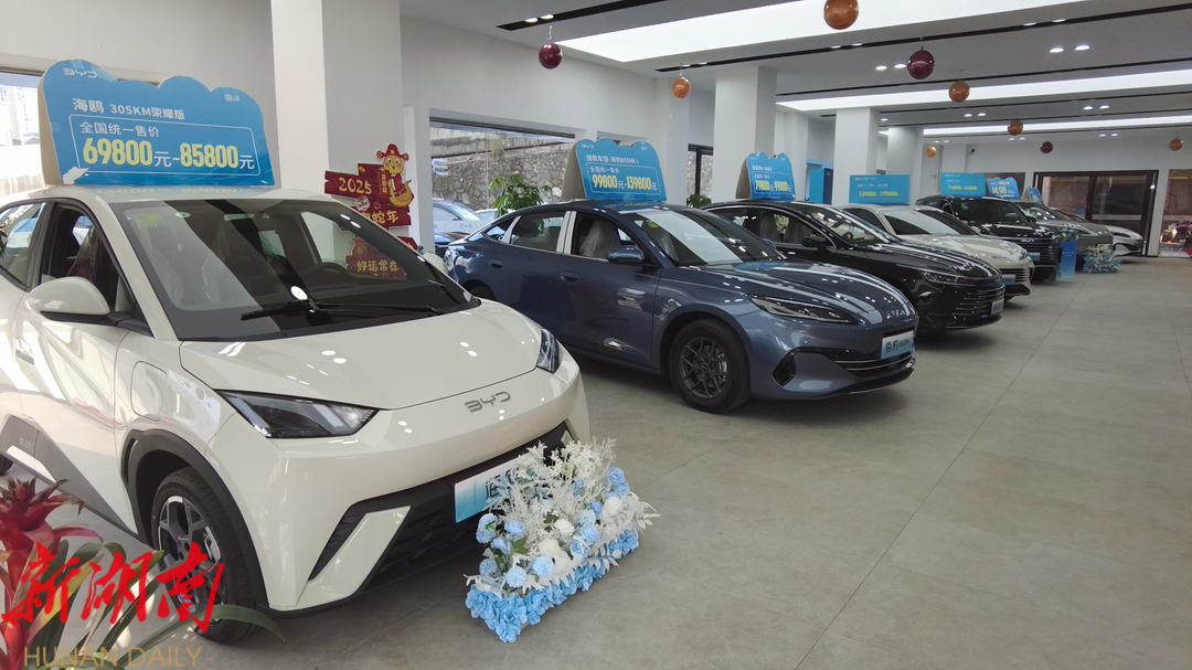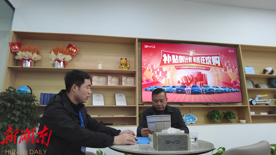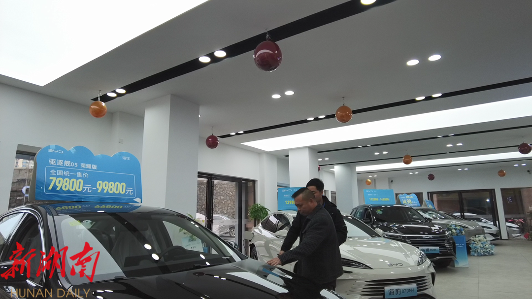 在永兴比亚迪汽车海洋销售店,市民黄洪辉正挑选着一辆他心仪已久的新能源车。他告诉记者,这次决定购买新能源车,不仅是因为对环保出行的向往和对未来科技的信赖,更重要的是,还能享受到政府推出的汽车以旧换新政策,这让他觉得这次购车决定既环保又实惠。